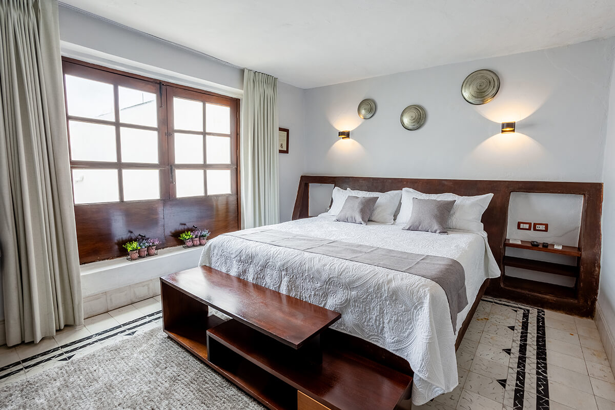 Habitación sencilla con techo muy alto, cama King Size, habitación en P.B (planta baja).