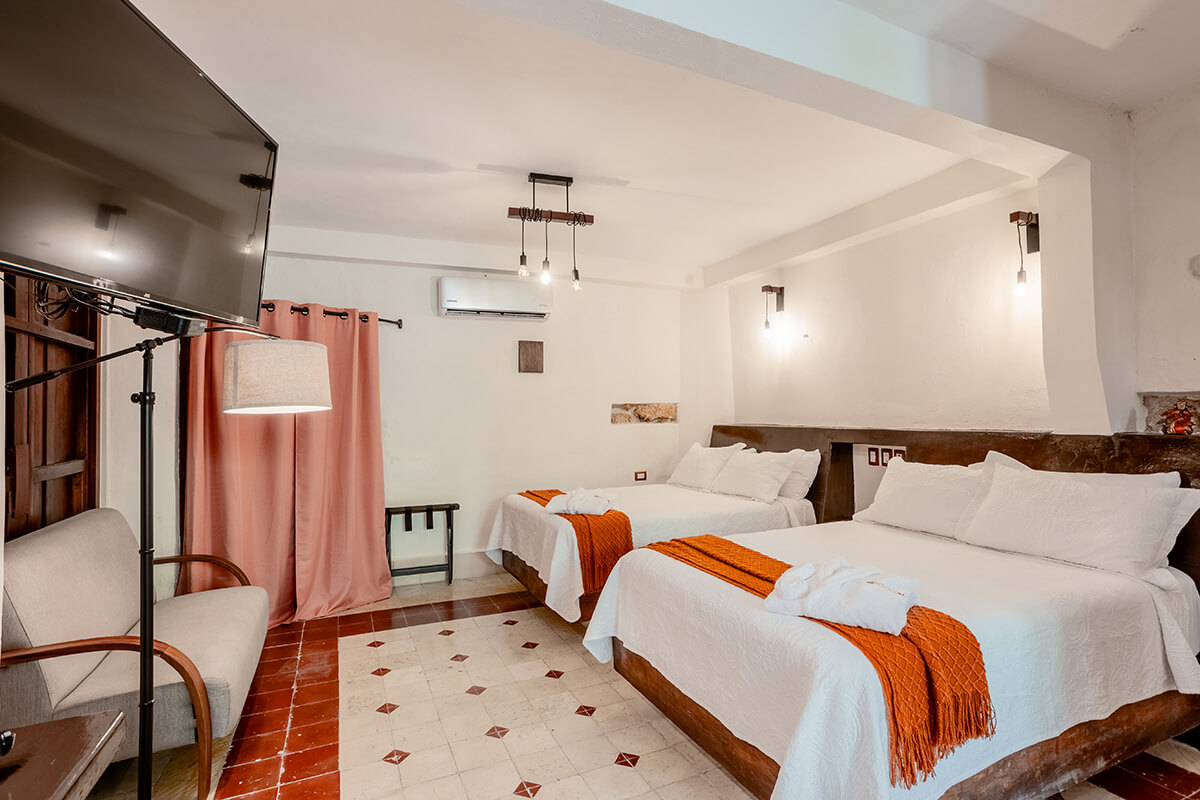 Habitación doble, 2 camas matrimoniales, habitación en P.B (planta baja) junto a la piscina.